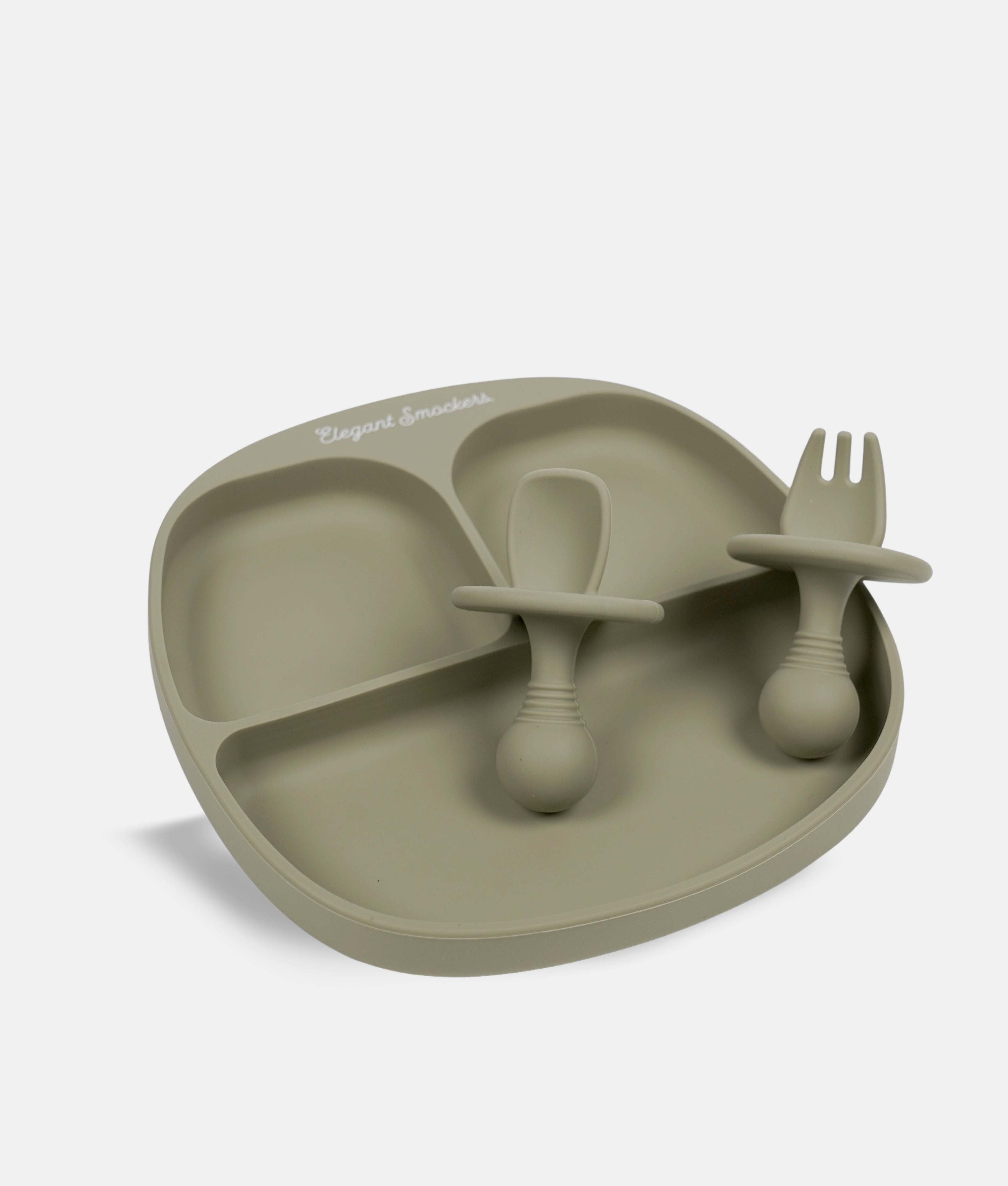 3 Compartments ES Silicone Suction Plate & Spoons Set - Olive Green