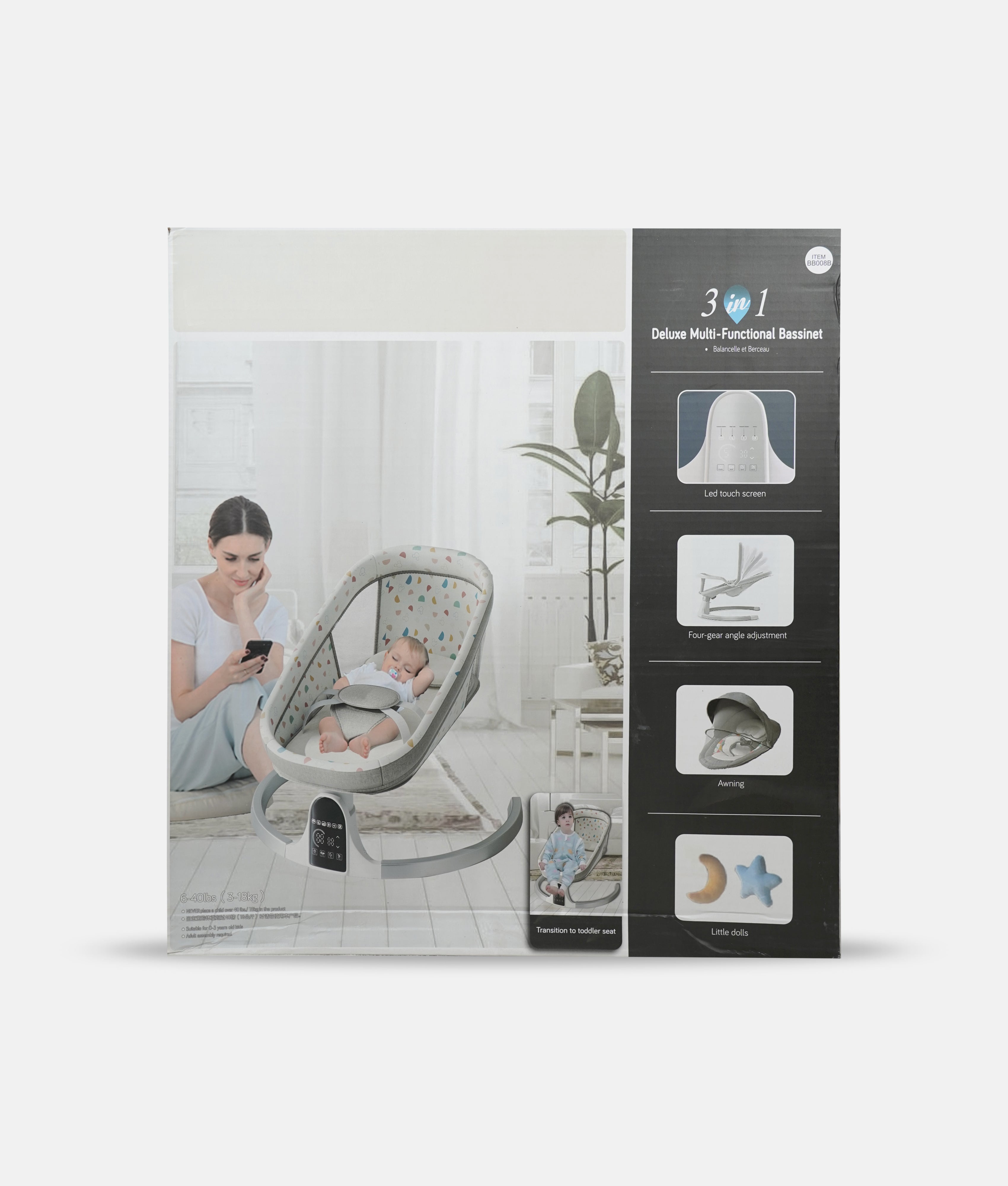 The Deluxe Multi-Functional Bassinet smart remote control  (3 in 1) (Item BB008B) that grows with your baby, transitioning from newborn bassinet to toddler seat. Features an interactive LED touch screen for sensory play, four adjustable angle positions for comfort, and a protective awning to create a calm sleep space. Includes adorable dolls for entertainment. One versatile piece for every stage!