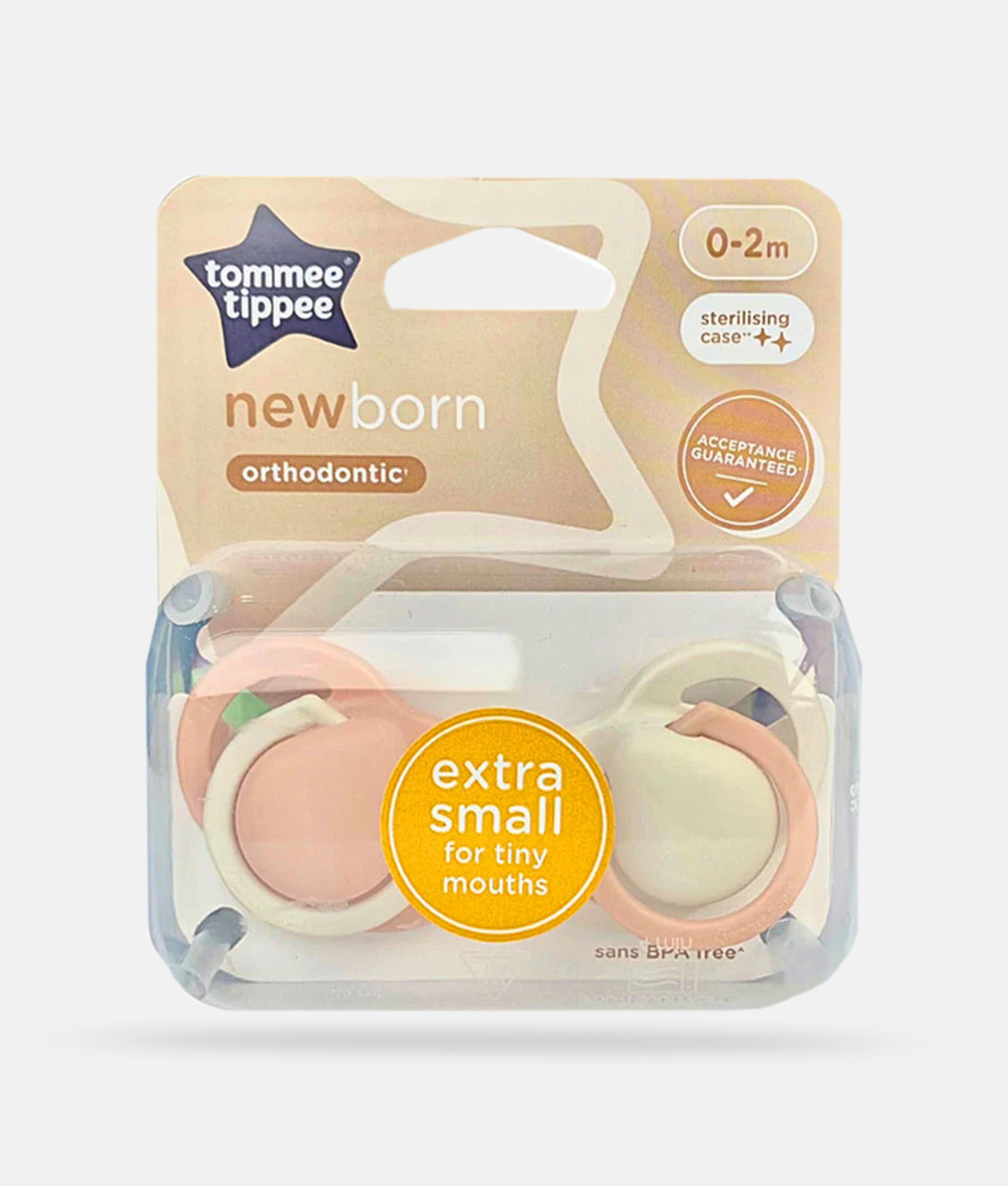 Tommee Tippee Orthodontic Soother, specially designed for newborns aged 0-2 months. This extra-small pacifier features an orthodontic nipple that supports natural mouth development while providing gentle comfort. The curved shield includes integrated air holes to minimize skin irritation and moisture buildup. BPA-free and crafted with safety in mind, it comes with a convenient sterilizing case for easy cleaning and travel. Acceptance guaranteed—trusted by parents for soothing tiny mouths with care and confidence.