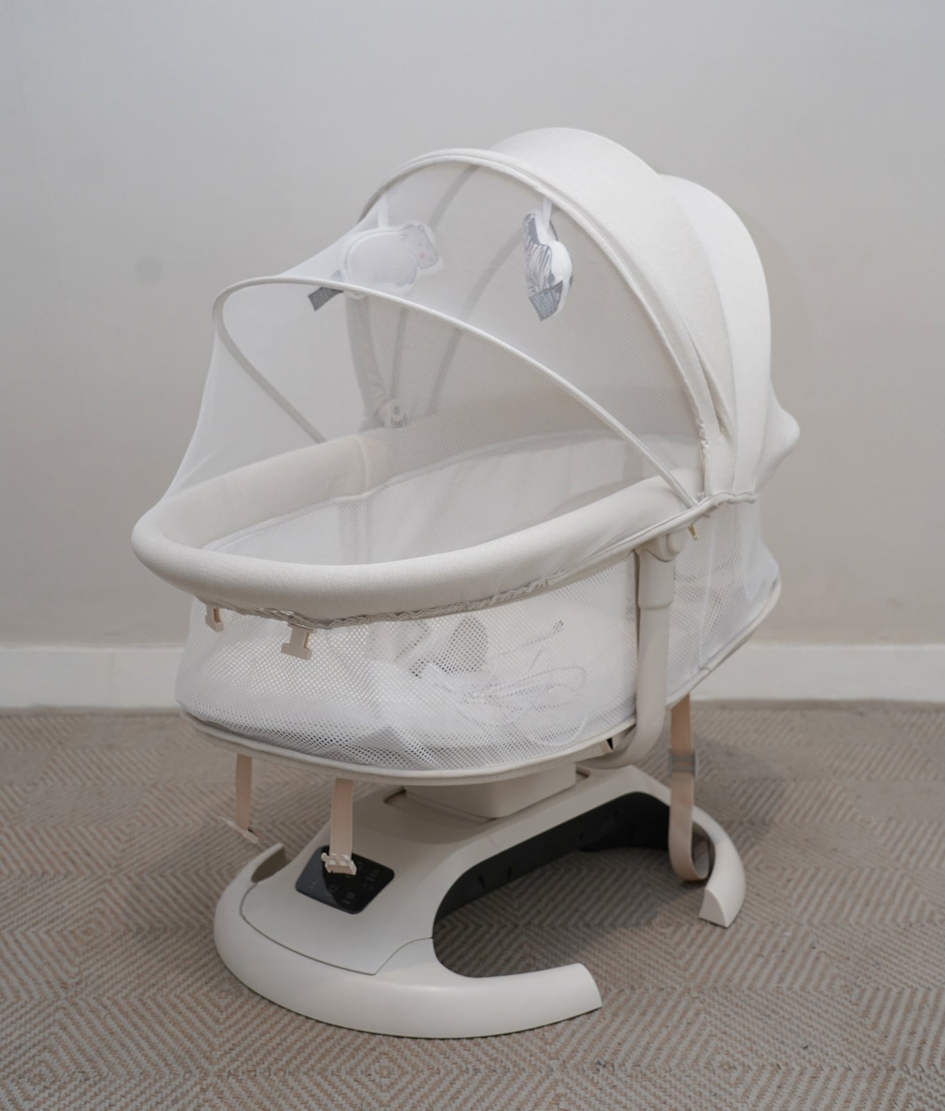 The Mastela - Infini Orbit Baby Cradle keeps your baby comfortable and entertained! Features include breathable mesh for airflow, gentle touch controls for soothing motions, a reclined backrest, mosquito net protection, and a fun toy bar. The roomy design and included adapter make setup simple. Perfect for parents seeking comfort, safety, and style in one cradle.