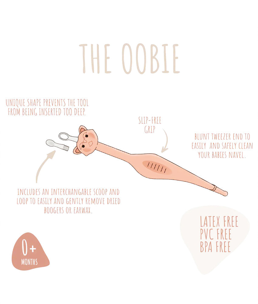 THE OOBIE includes a loop end to remove sticky and rubbery boogers whilst the scoop is ideal for removing dried snot or ear wax. The blunt tweezers end provides precision to easily remove trapped navel gunk.