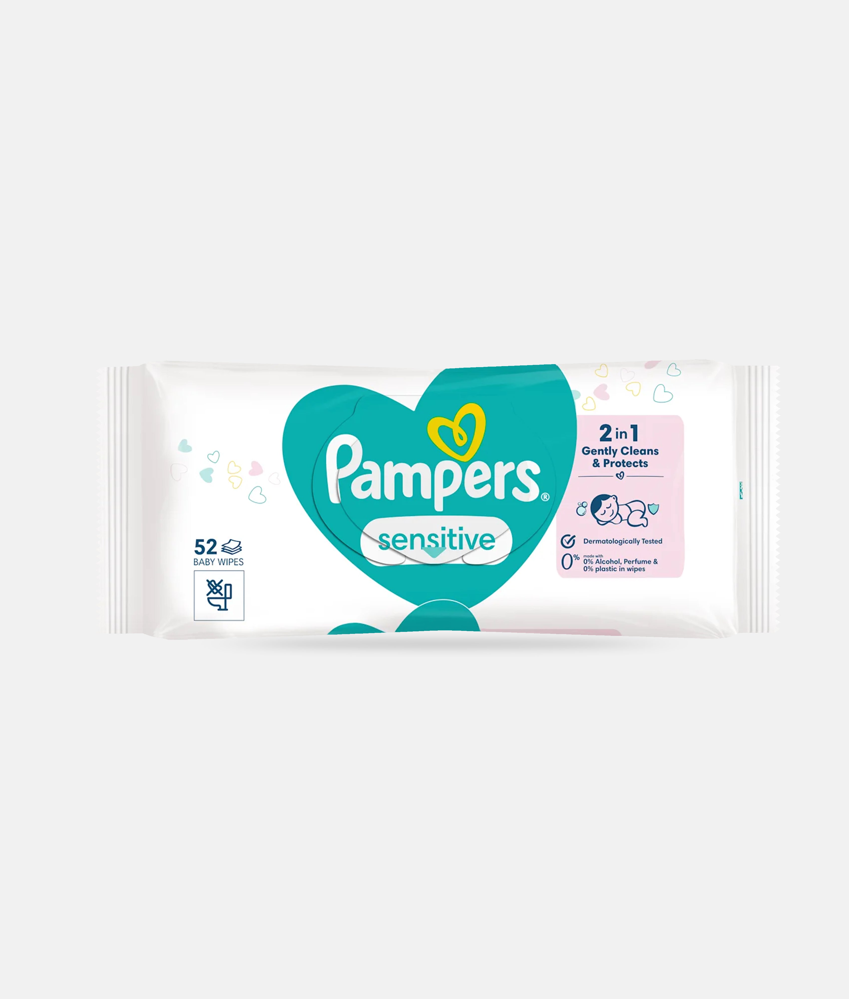 Pampers Sensitive Baby Wipes deliver gentle care for delicate skin. This 52-count pack features a 2-in-1 formula that cleanses and protects with every wipe. Dermatologically tested and free from alcohol, perfume, and plastic, these wipes are ideal for frequent diaper changes. Soft, hypoallergenic, and designed for sensitive newborn skin, they provide reliable cleansing without irritation.
