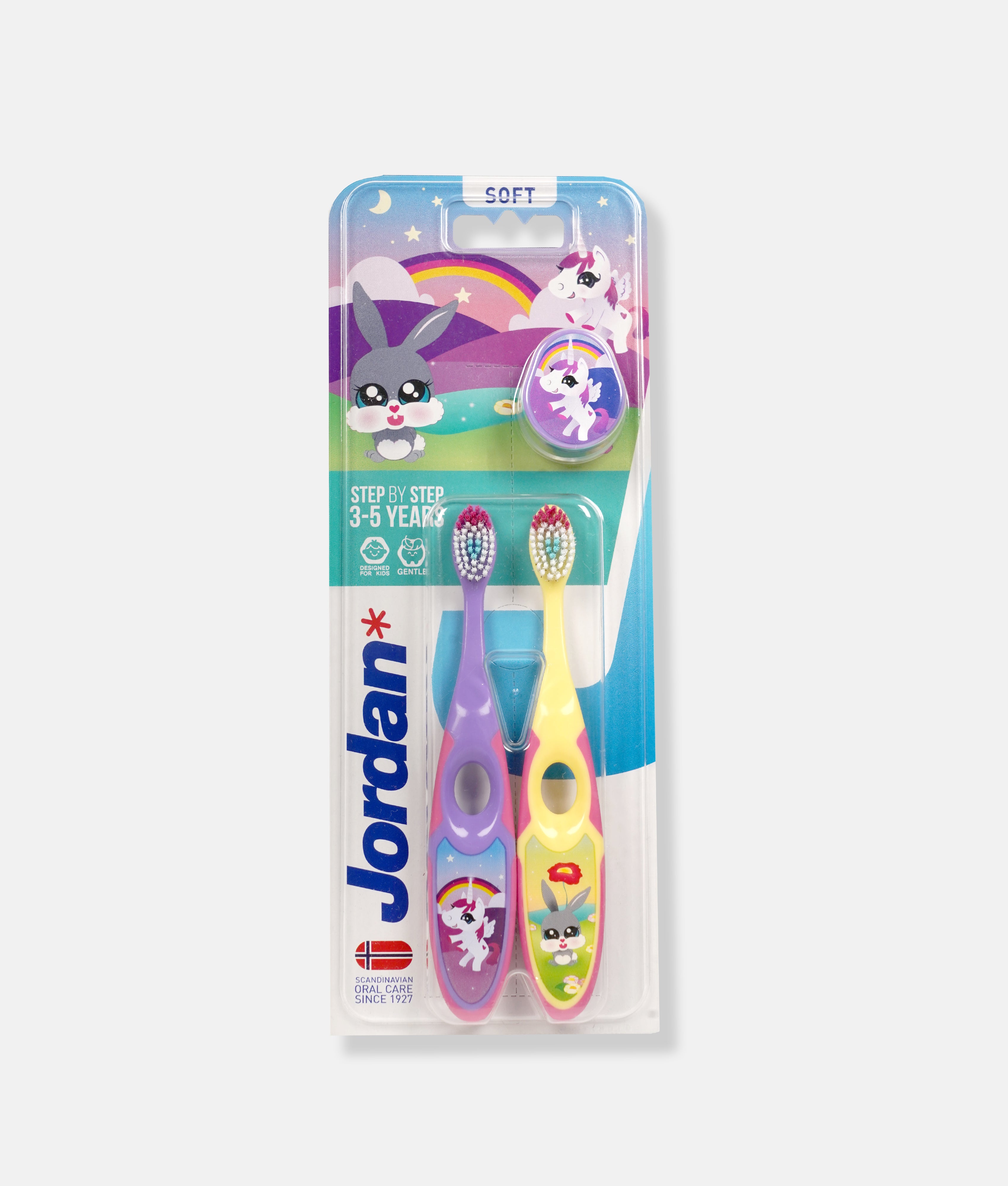 Brush time just got magical! This delightful toothbrush set features soft bristles perfectly sized for little milk teeth, with a wide head that's easy for small hands to grip. The dual handle design lets parents guide brushing while kids learn independence. Blue bristles act as a handy guide to show exactly how much toothpaste to use each time. With charming rainbow bunny and unicorn designs, your child will actually look forward to their daily dental routine. Make oral care fun and effective from the very first brush!