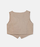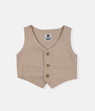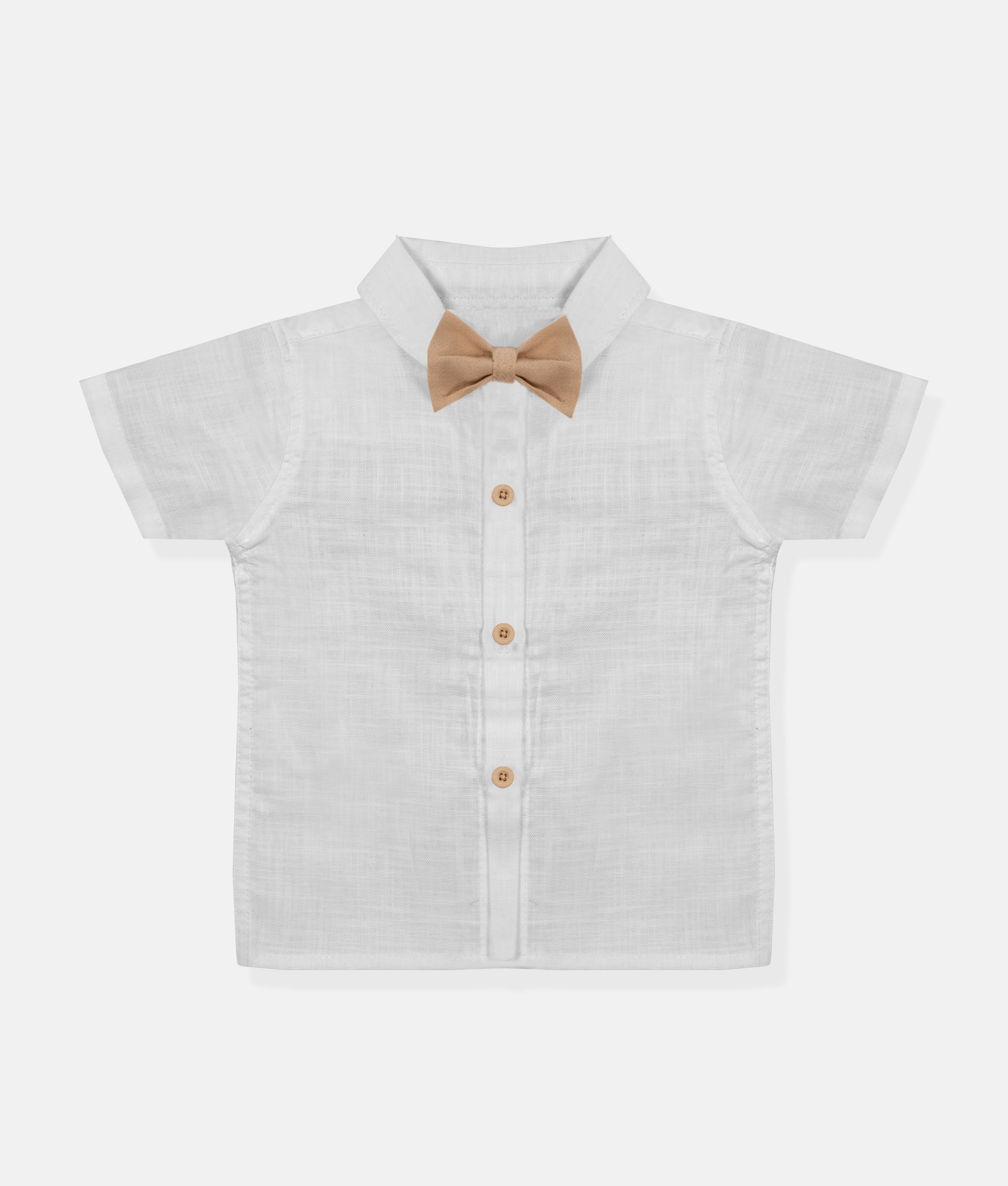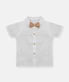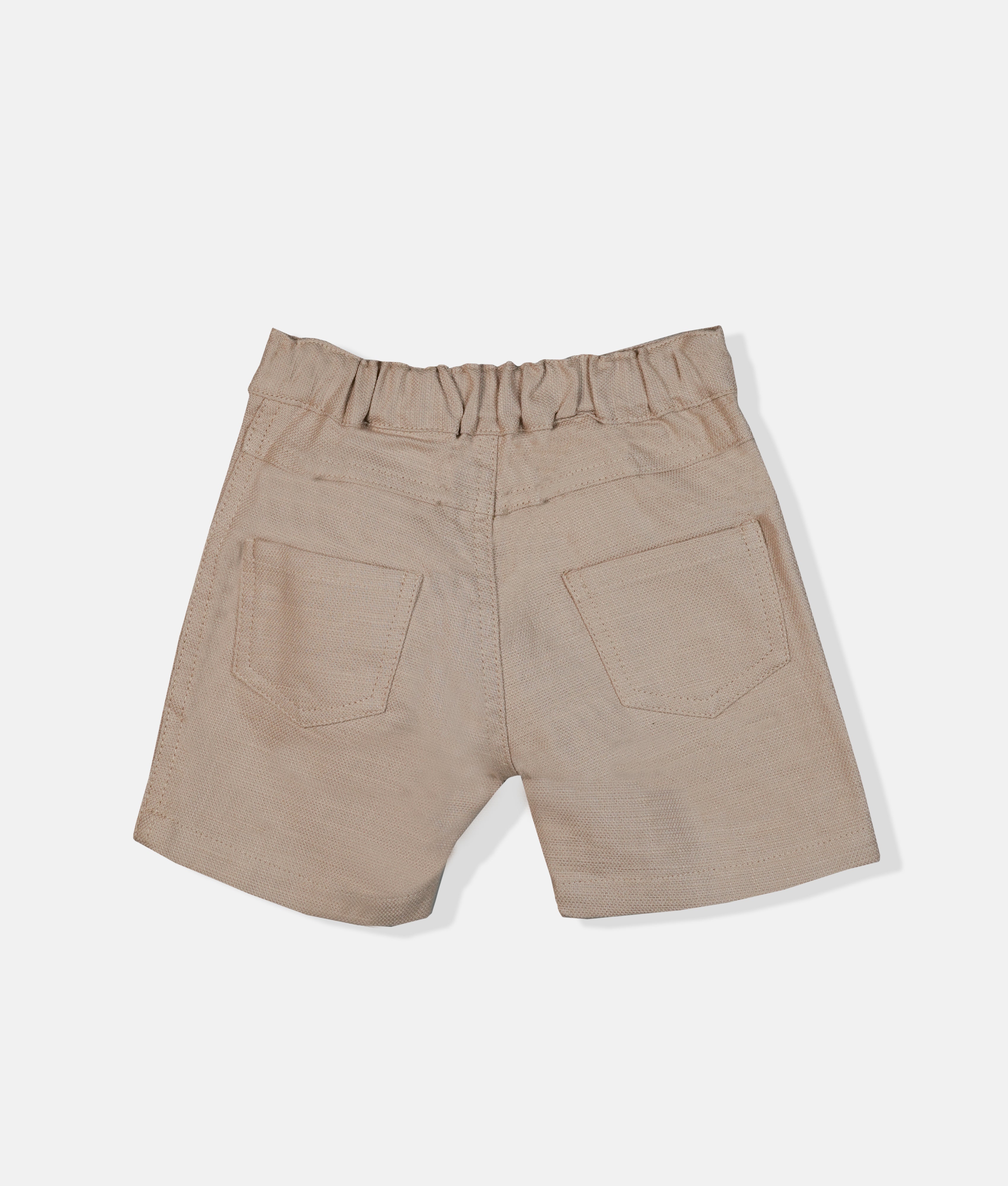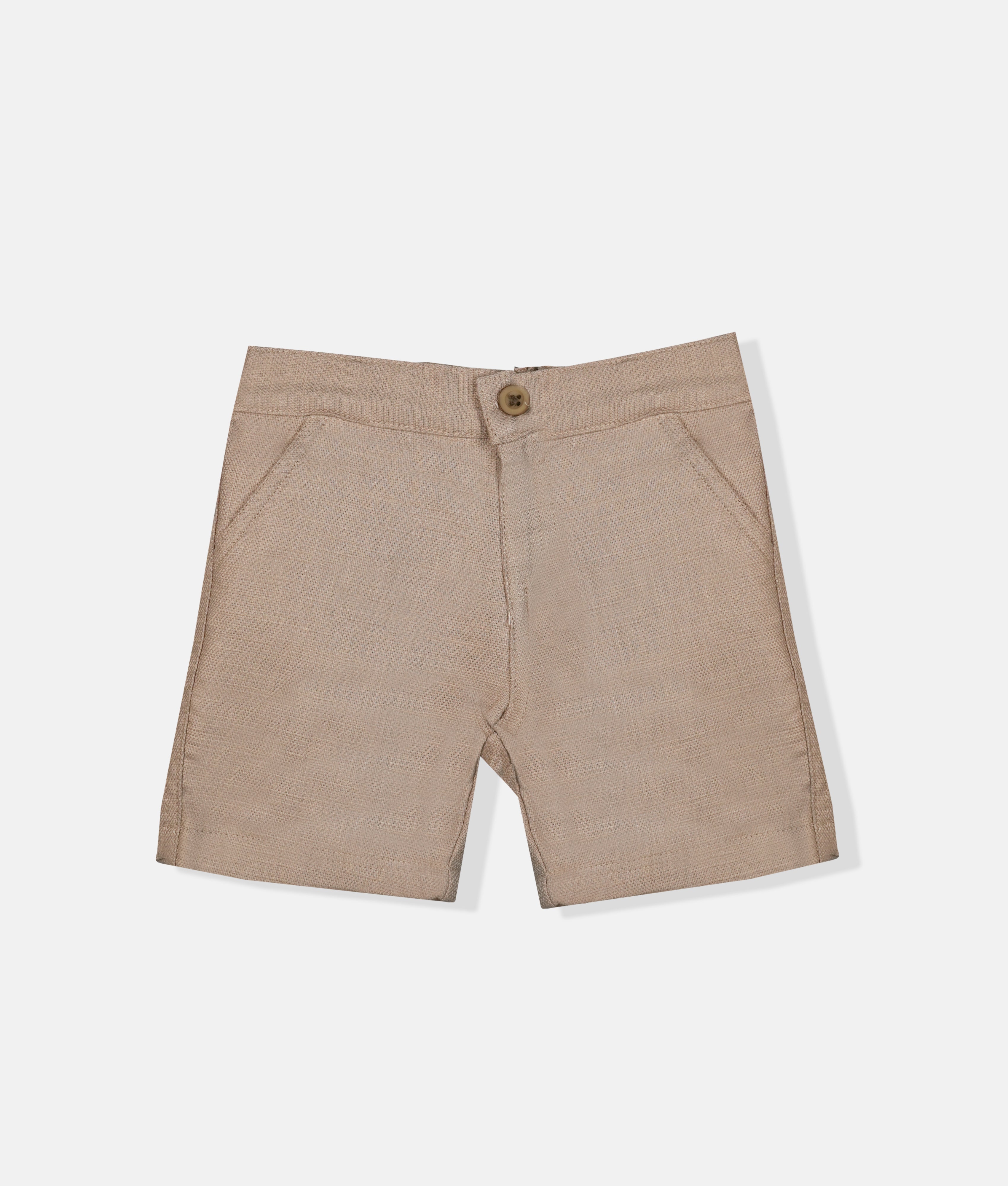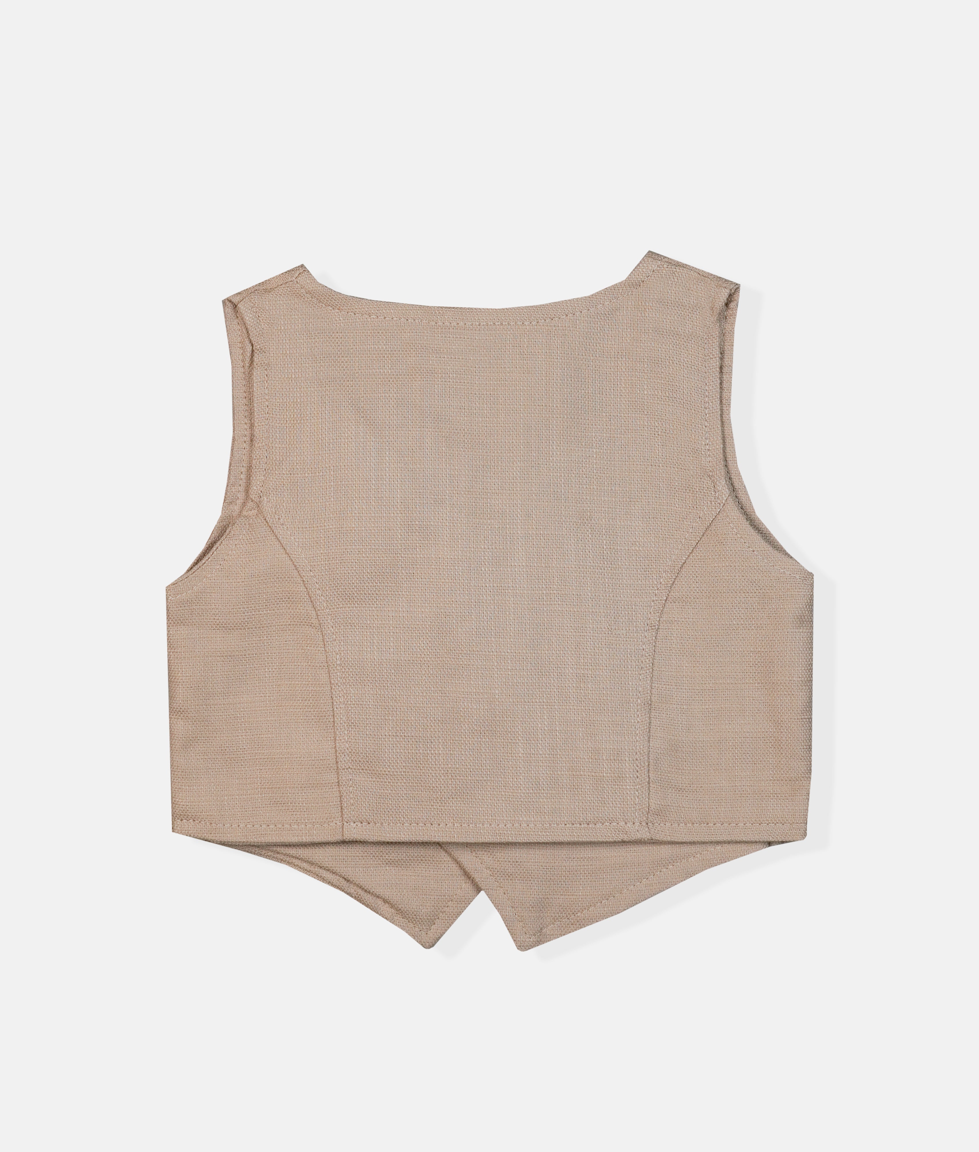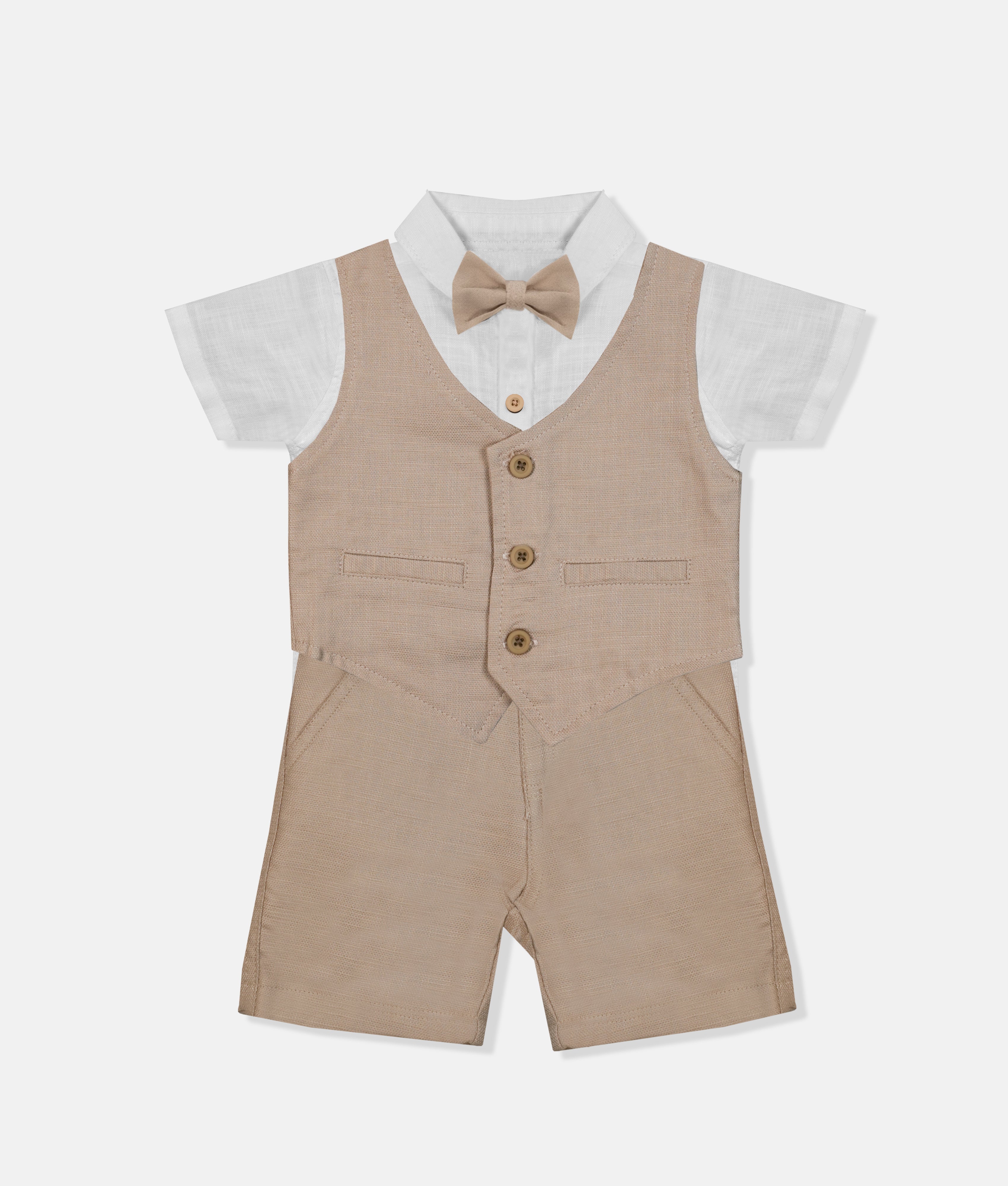 Complete 4-piece formal set in soft sandstone beige for your little gentleman. Includes a tailored waistcoat, chino shorts, white shirt, and pre-tied bow tie everything coordinates perfectly. Crafted from breathable linen-cotton blend that keeps him cool and comfortable. Elasticated waistband allows easy movement for play. Ideal for weddings, christenings, family photos, and special celebrations. A quick steam before the event keeps the look polished and sharp.