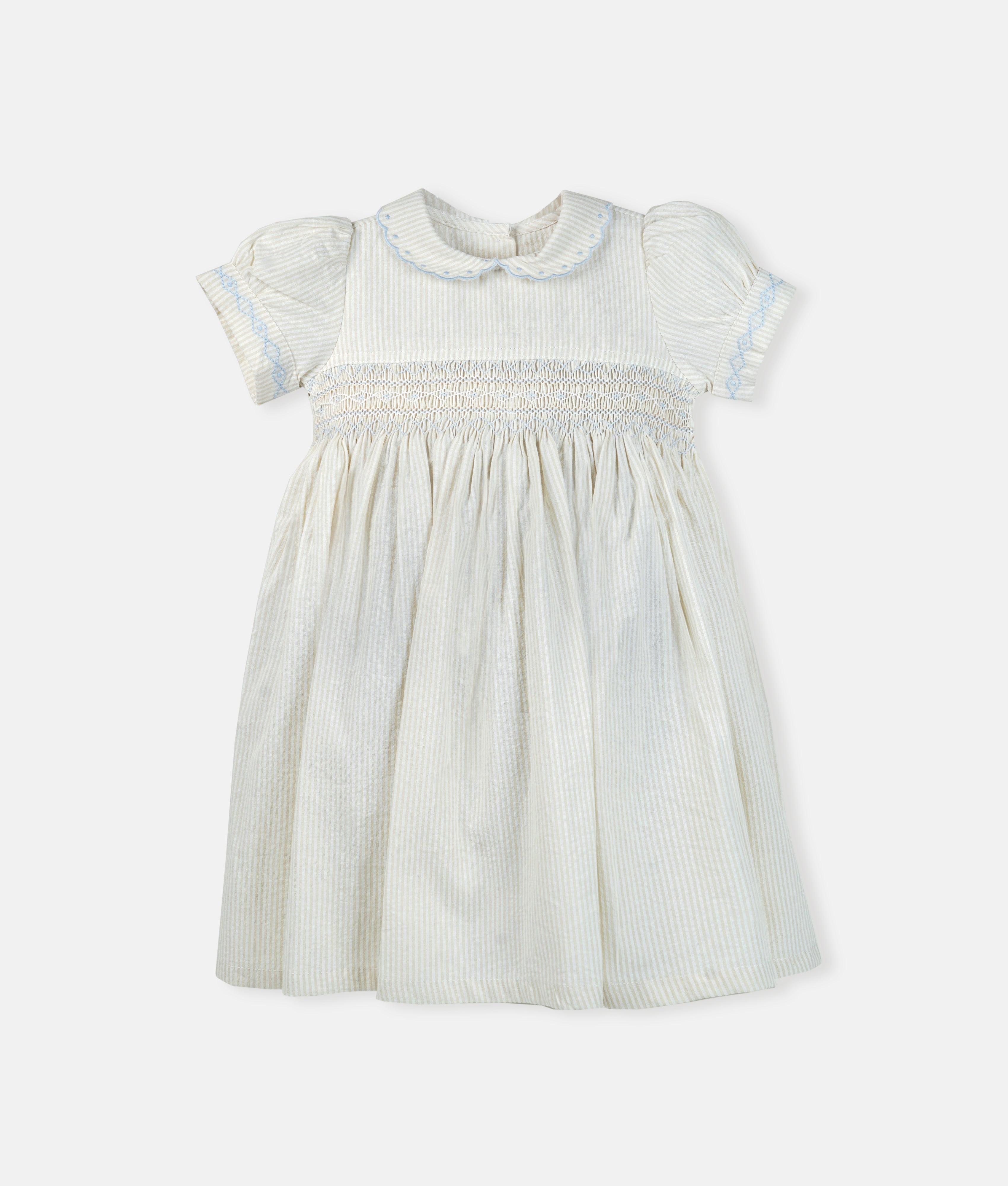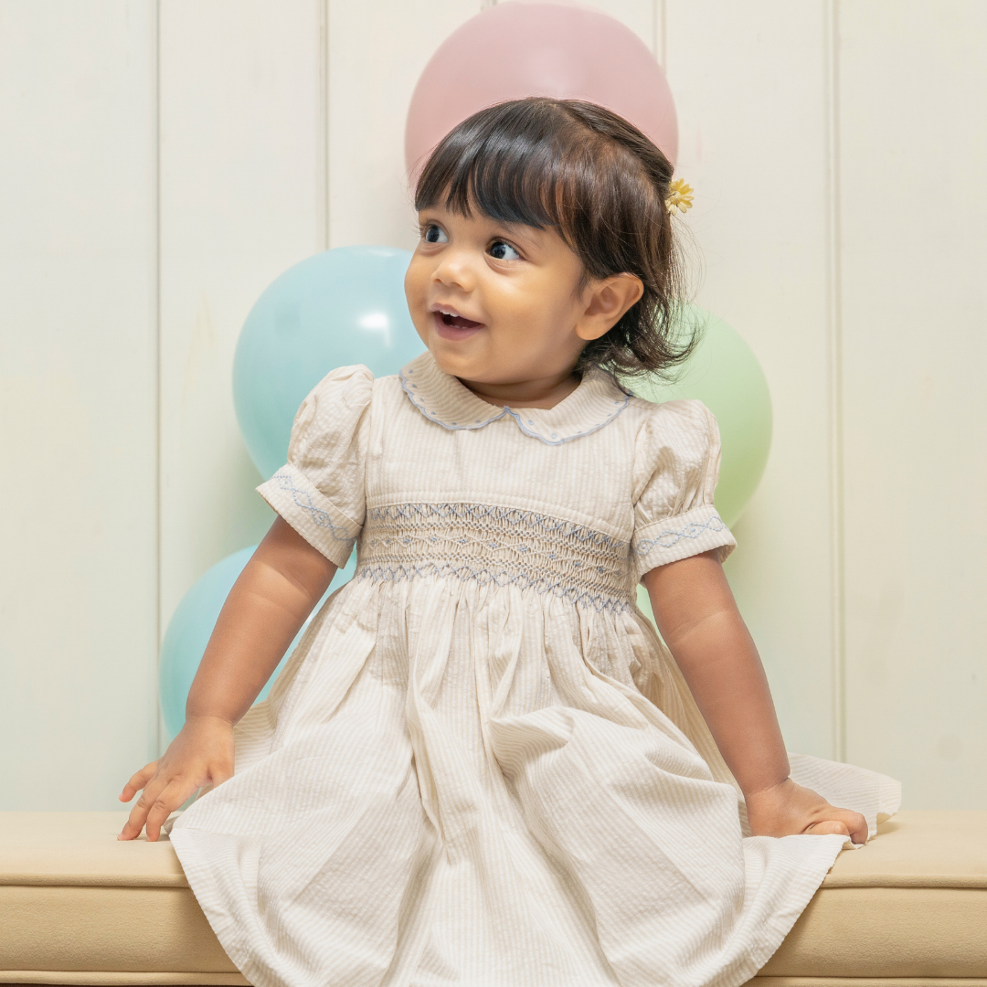 Brighten up every school day with the Vanilla Cream Stripes Smocked Girls Dress. Its playful striped pattern and comfy smocked design let your little one move freely while looking adorable. Perfect for casual wear or everyday adventures, this dress combines softness with style for fun, fuss-free outfits.