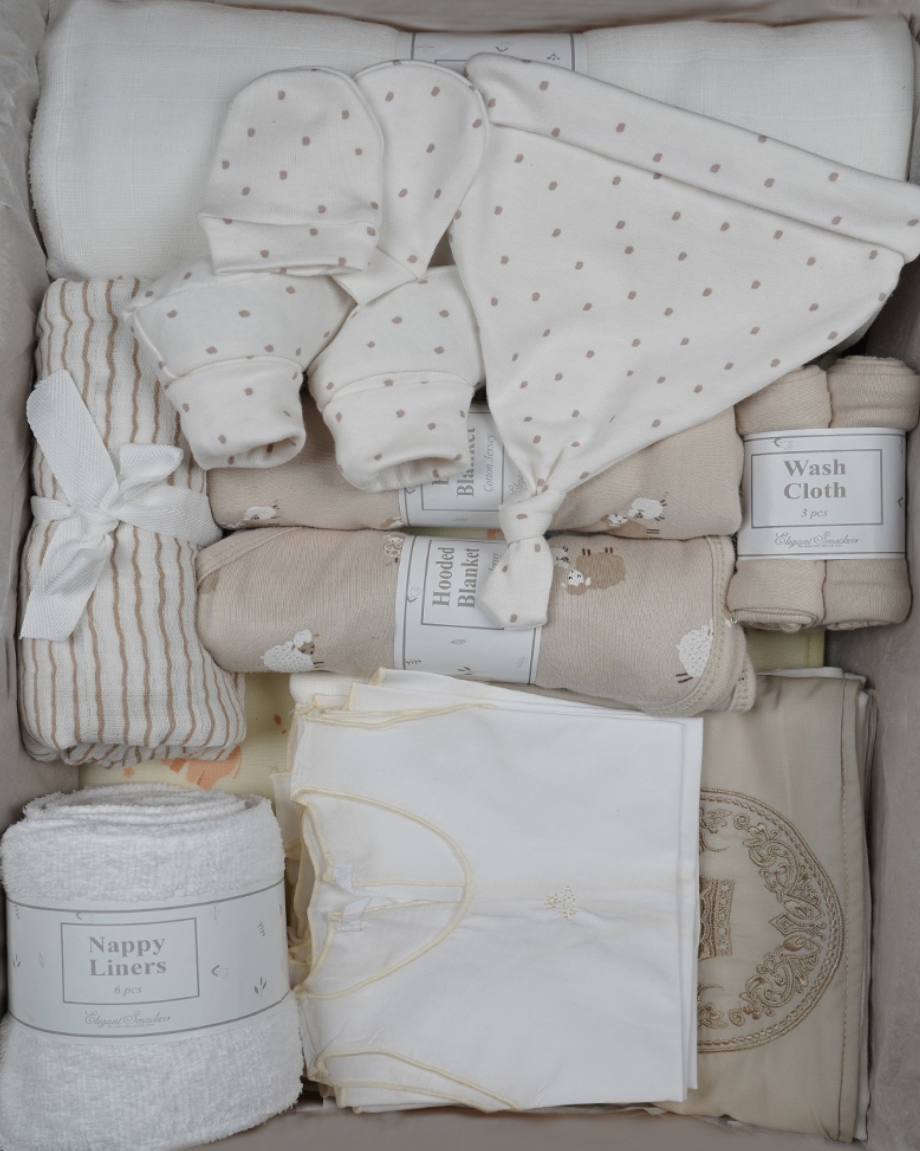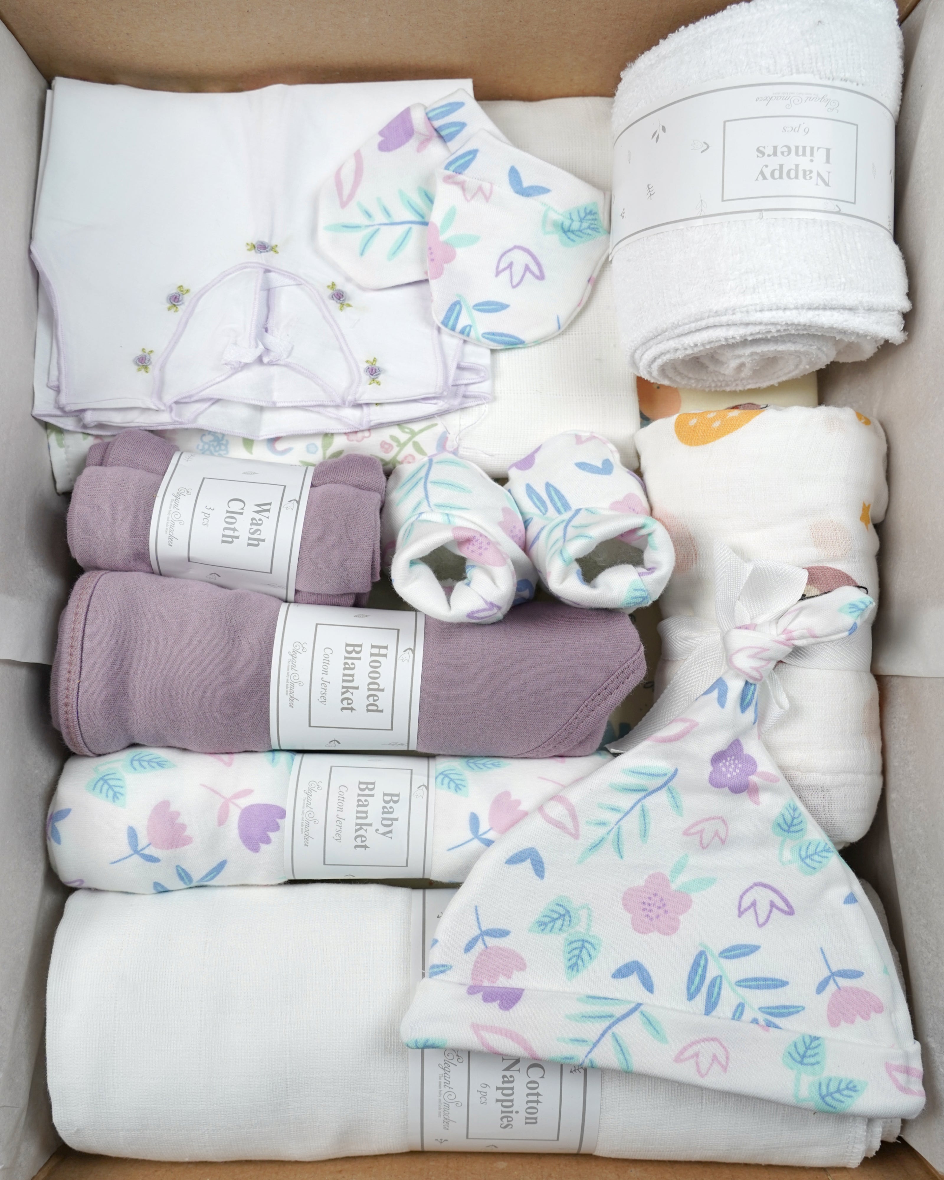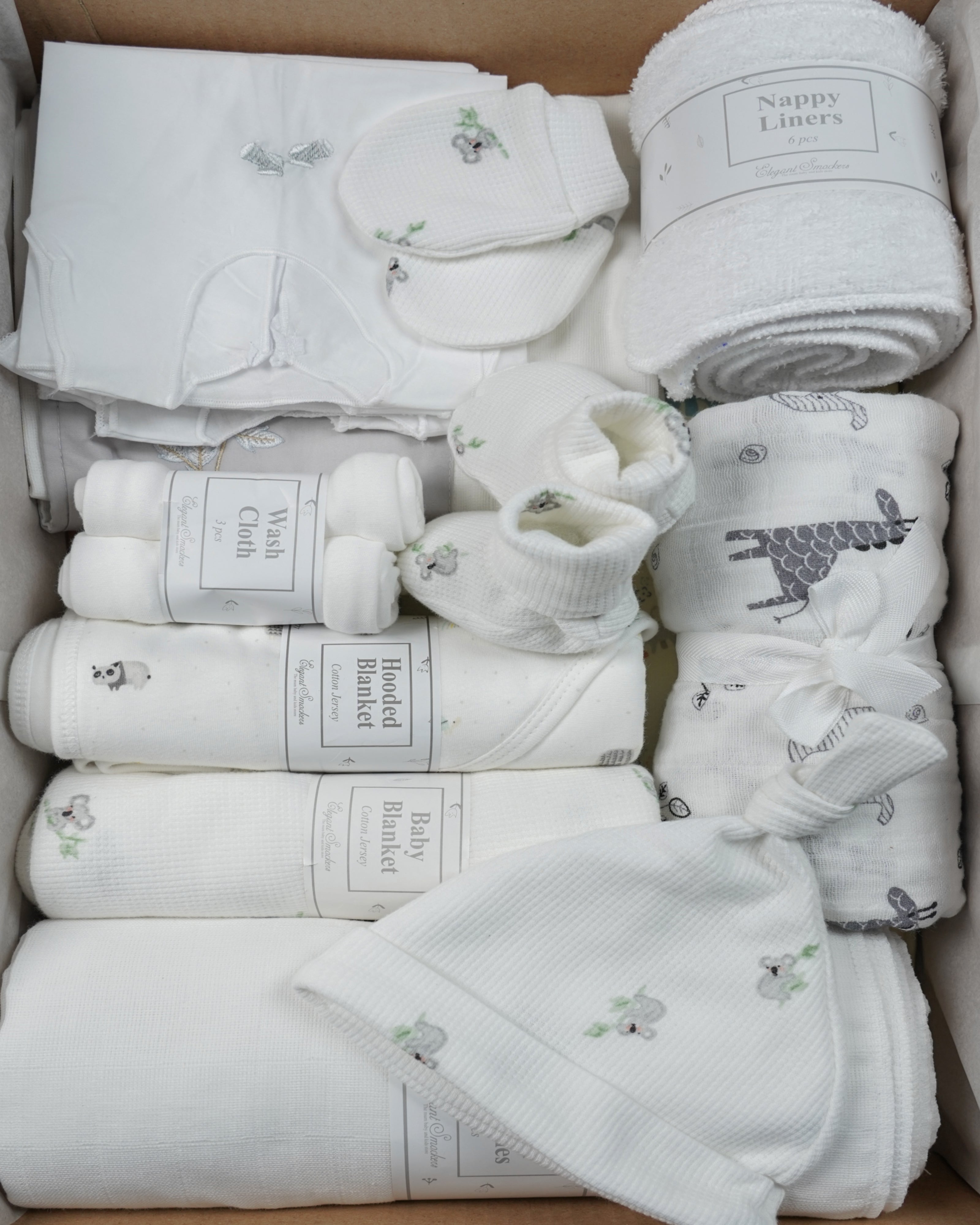 A truly elegant gift, made effortless. Each hamper features a beautifully crafted Moses basket, wrapped in delicate tulle for that extra touch of elegance. It's filled with thoughtful essentials tailored to your selected budget, baby’s age, and gender.