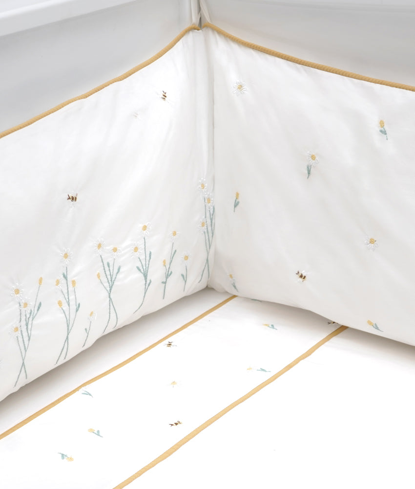 Cot Bumpers are essential for the safety of your little one as they start to move on their feet. A beautifully soft and padded bumper for your baby's cot with wide sides for greater comfort and protection. The outer fabric is made from high quality 100% cotton, and bumper cushions filled with poly-fiber padding. The cot bumper is fastened with ties.
