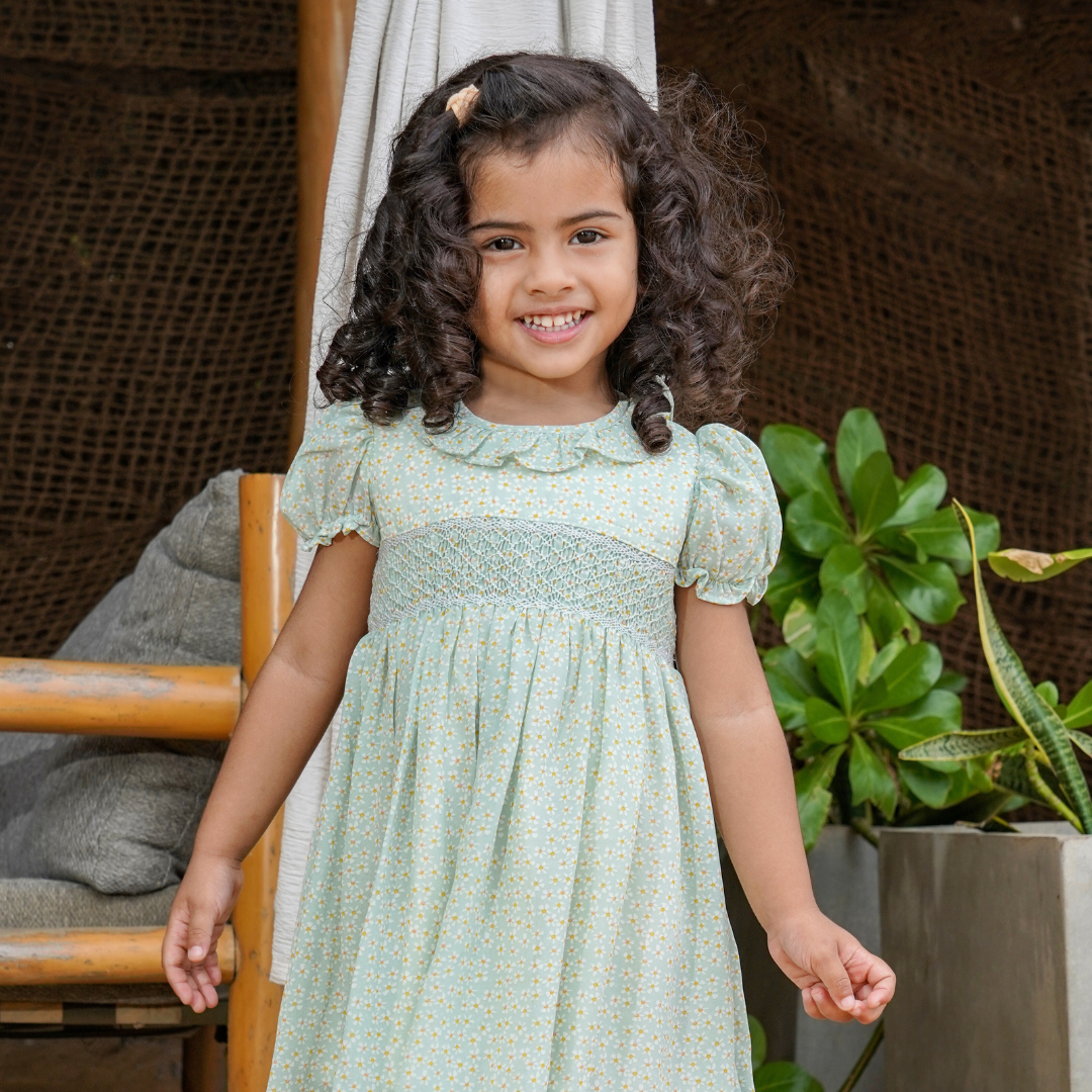 Pastel Pistachio Floral Collared Girls Smocked Dress