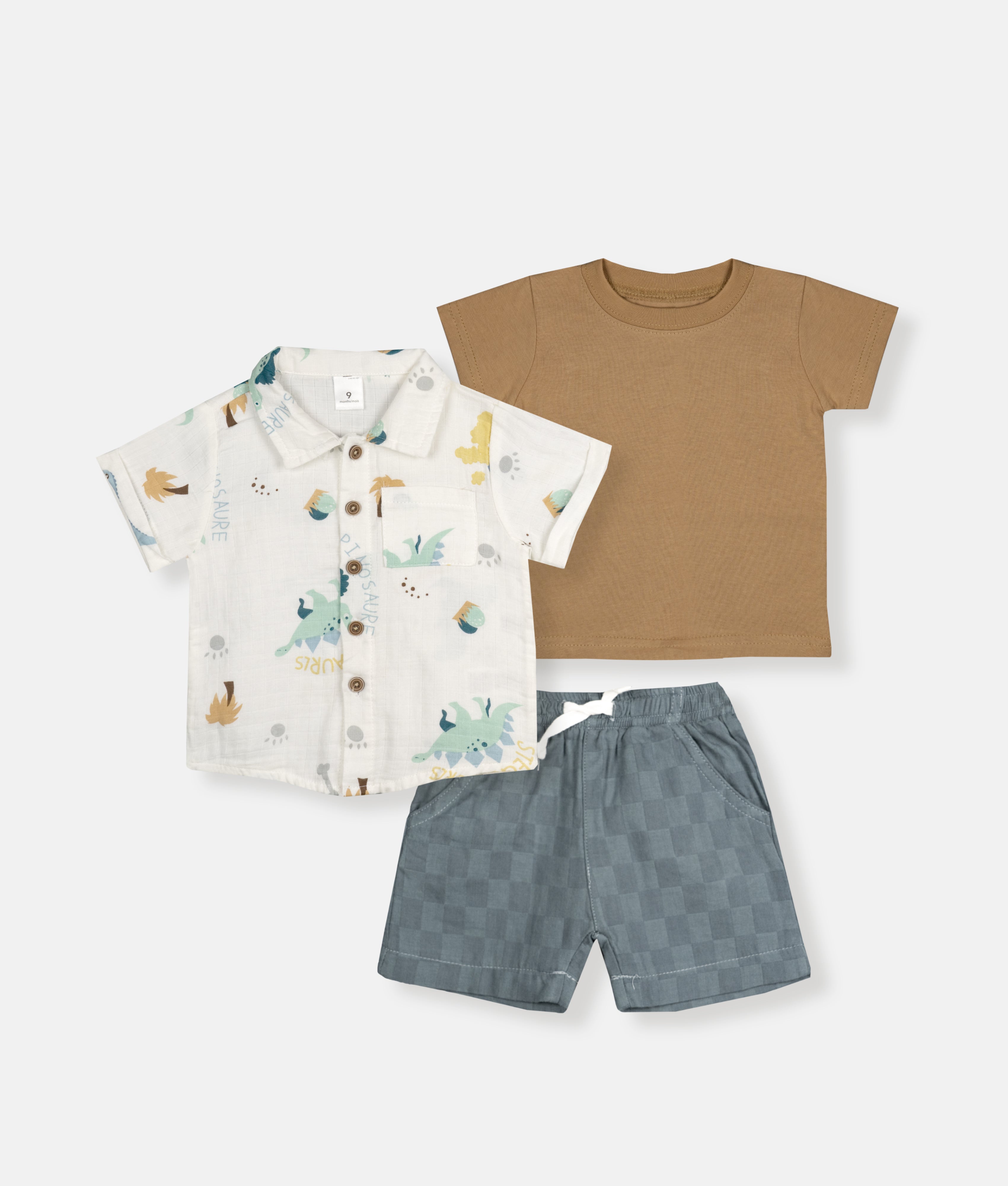 Wrap your little one in comfort with the Dino Dreamwear Baby 3Pcs Set! Crafted from soft, breathable fabric, this delightful collection keeps your baby cozy from head to toes throughout every adventure. The charming dinosaur-inspired design brings playful joy to naptime, playtime, and cuddle sessions alike. With a gentle, comfortable fit, changing outfits becomes effortless for busy parents. Perfect for all-day wear, this three-piece set is your go-to choice for keeping your baby snug, happy, and adorably dressed!