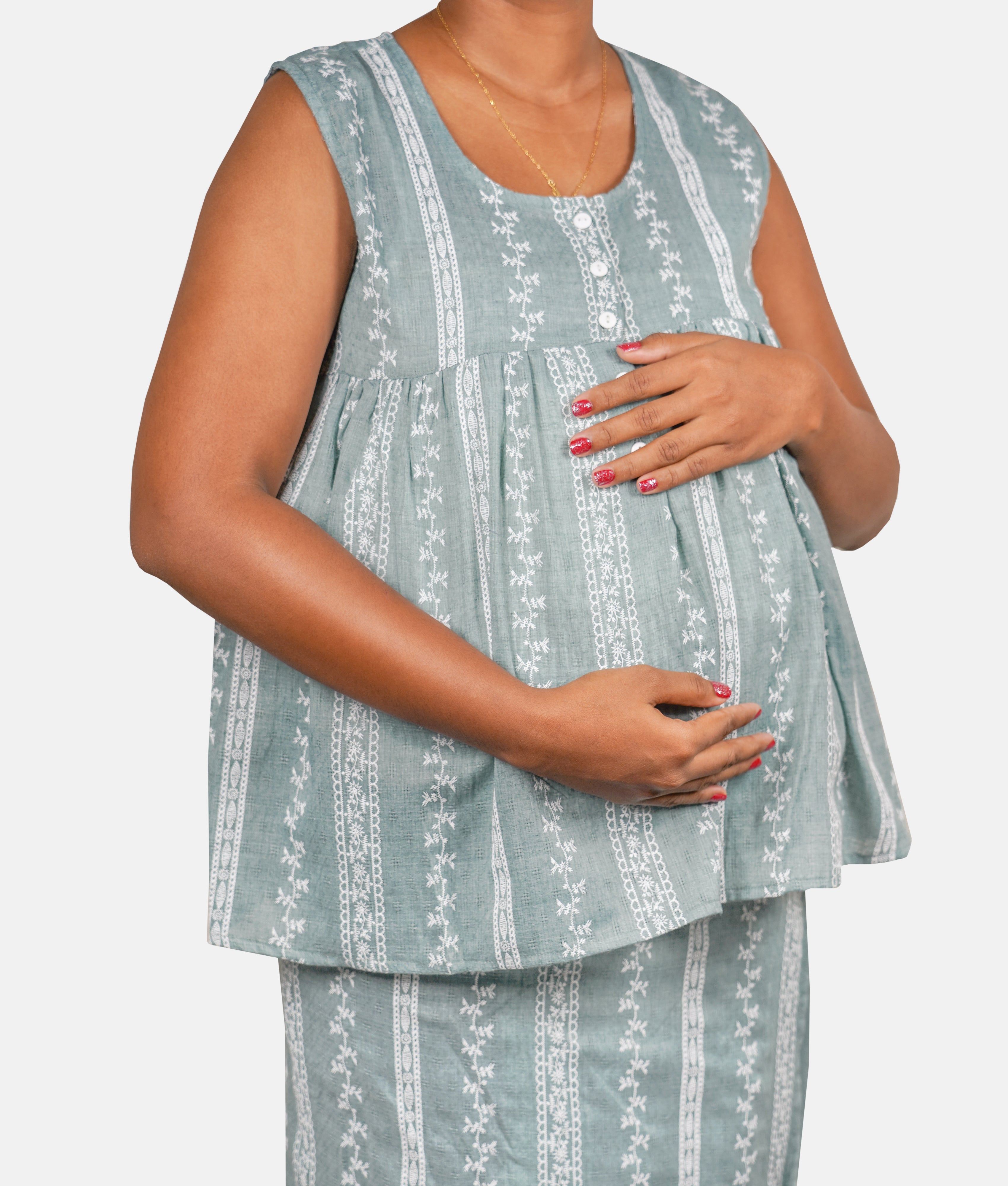 Sage Green Running Stitch Floral Motif Maternity 2Pcs Set