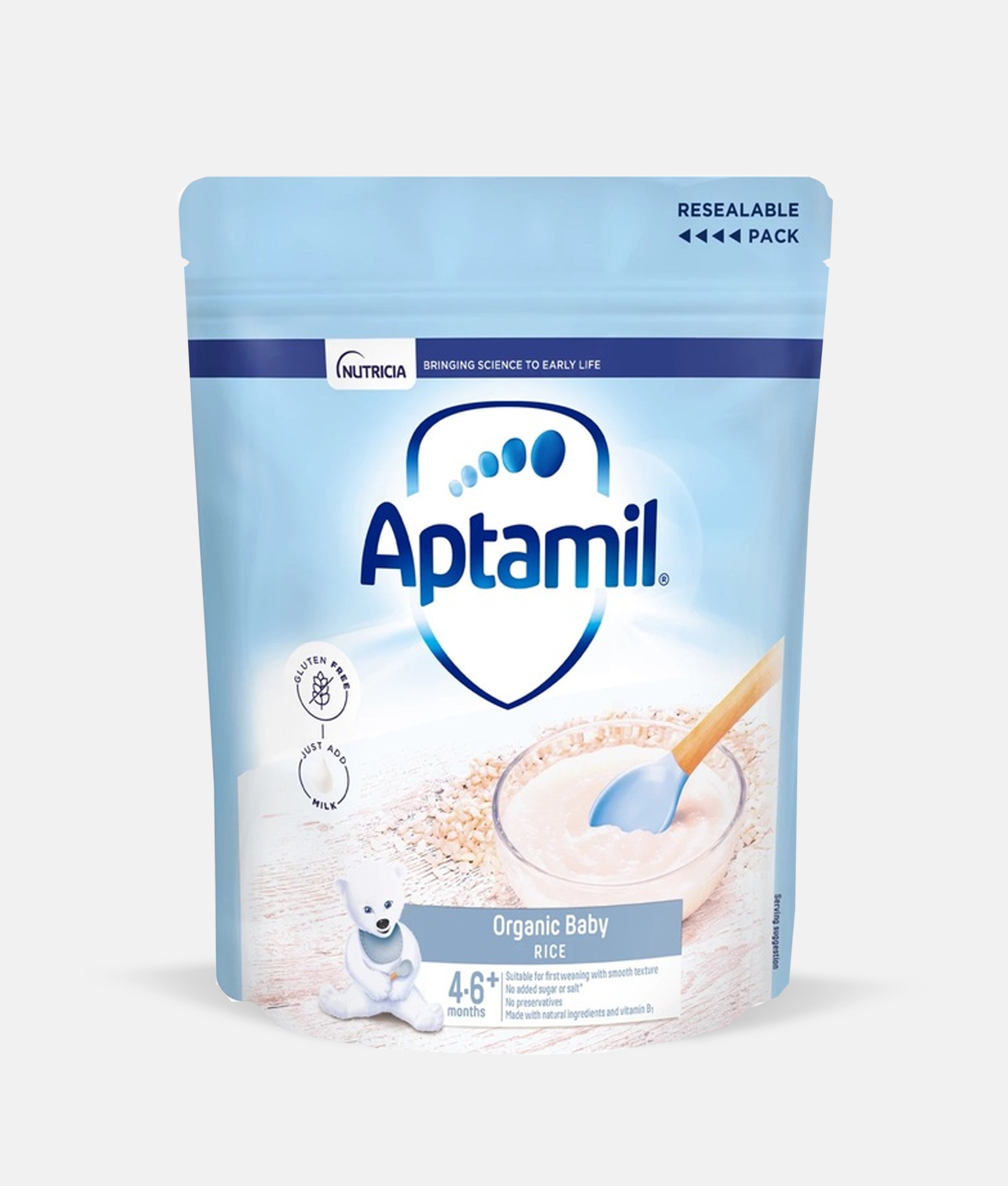 Aptamil Organic Baby Rice is thoughtfully crafted for little ones aged 4-6+ months. This gentle first food blends 41% milled cerealsāprimarily corn and riceāwith 25% skimmed milk powder for familiar dairy comfort. Enriched with essential vitamins (A, C, Dā, Bā) and minerals like calcium and iron, plus prebiotics GOS and FOS to support healthy digestion, each spoonful nourishes growing bodies. A touch of plant-based oils rounds out this wholesome, organic introduction to solid foods.