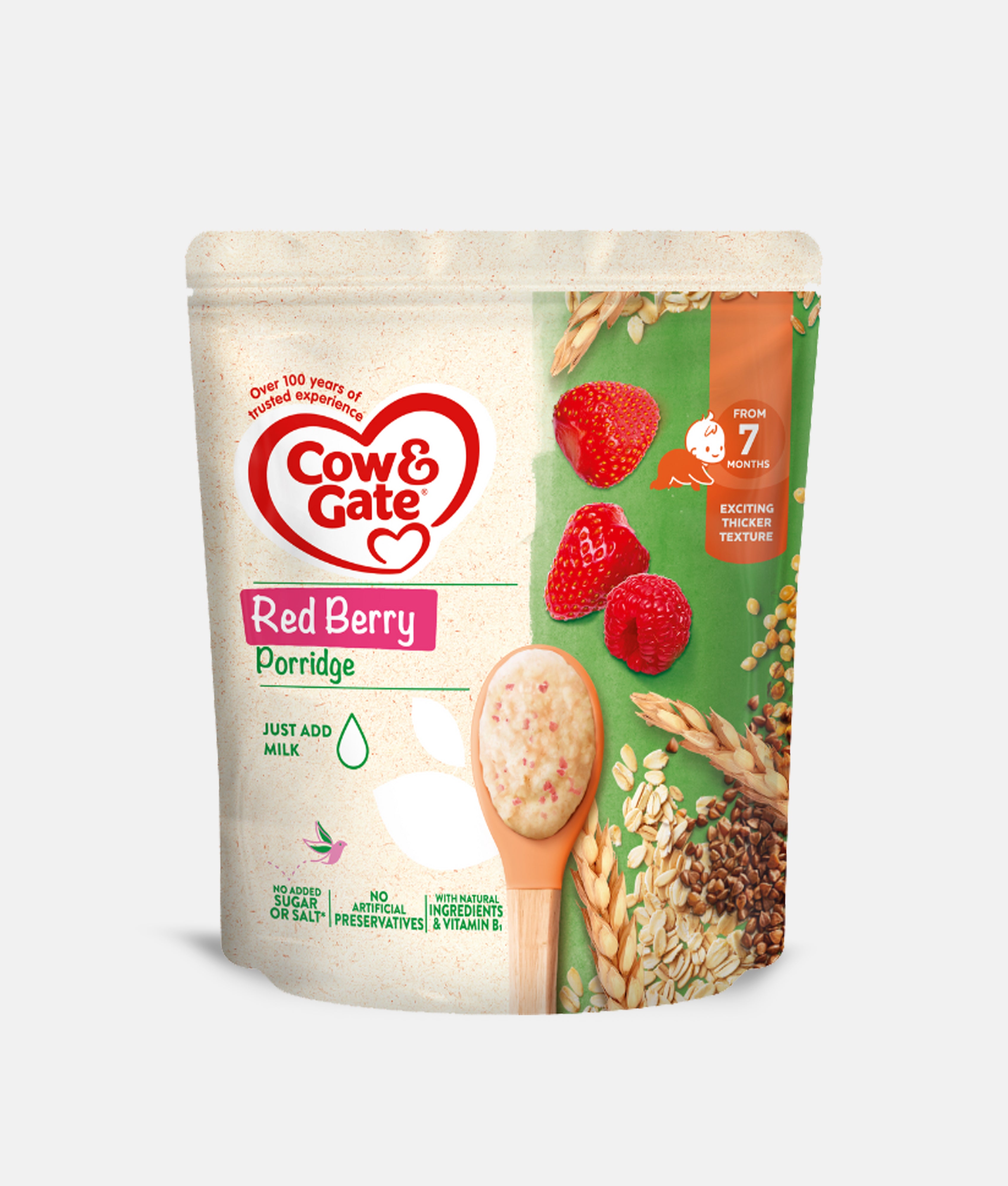 Cow & Gate Red Berry Porridge makes weaning fun with delicious red berries and wholegrain wheat from trusted farmers. Packed with natural ingredients and backed by over 100 years of expertise, it introduces your baby to new tastes and textures while supporting healthy eating habits from the start.