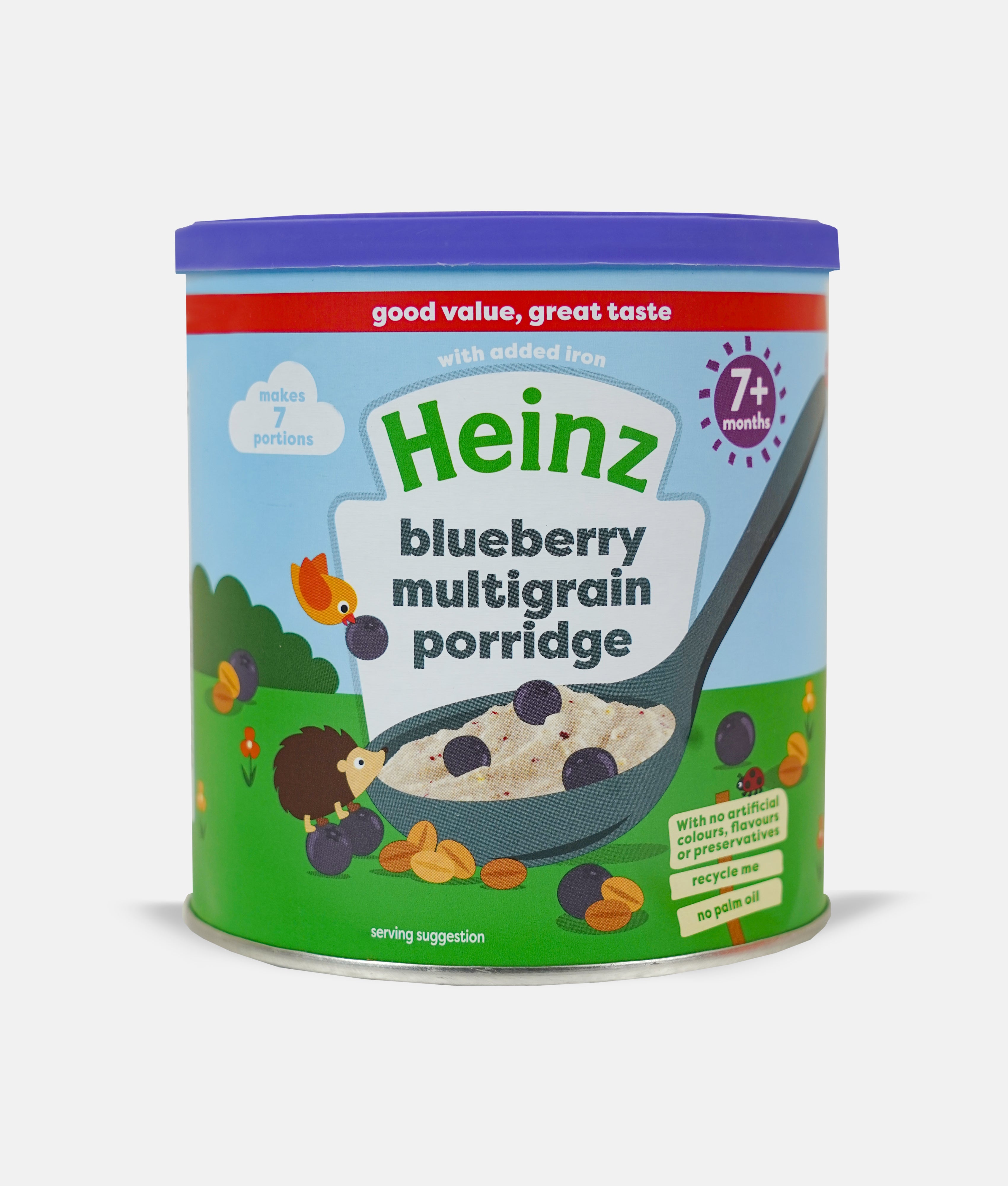 Mixed Fruit flavoured multigrain porridge with banana, blueberries, milk, and added vitamins and minerals.