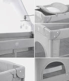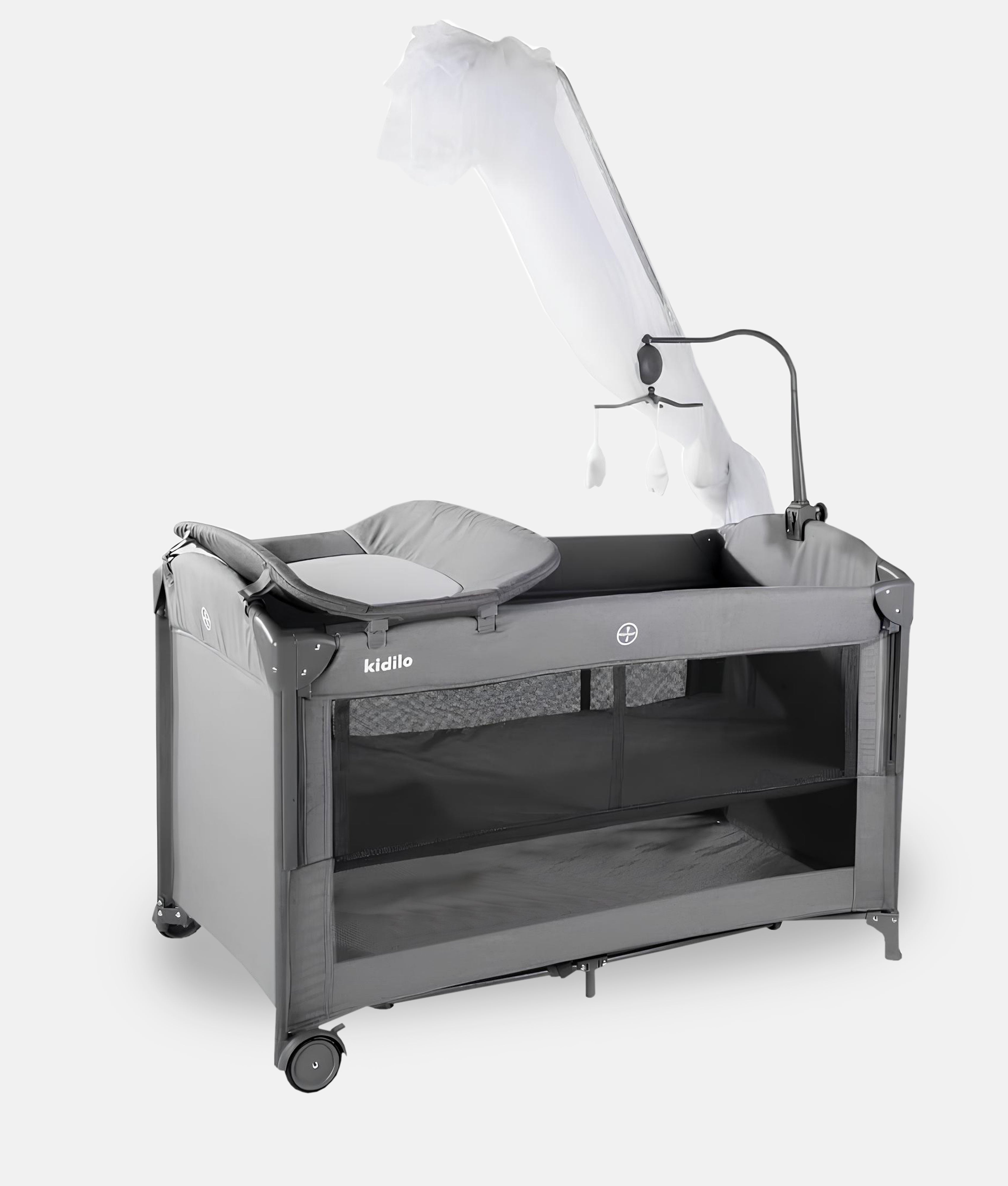 The Kidilo Multifunctional Baby Bed T-702L is a versatile sleep and care solution designed for modern parents. This innovative crib transforms to serve multiple purposes: co-sleeper attachment for safe bedside sleeping, integrated changing table for convenient diaper changes, and rocking function for soothing your baby. Features include a protective mosquito net, secure zipper gate for easy access, sturdy two-wheel base with brakes for mobility, included toy set for entertainment, and a practical carry bag for travel. Compact yet feature-rich, it adapts to your growing family's needs while keeping everything within arm's reach.