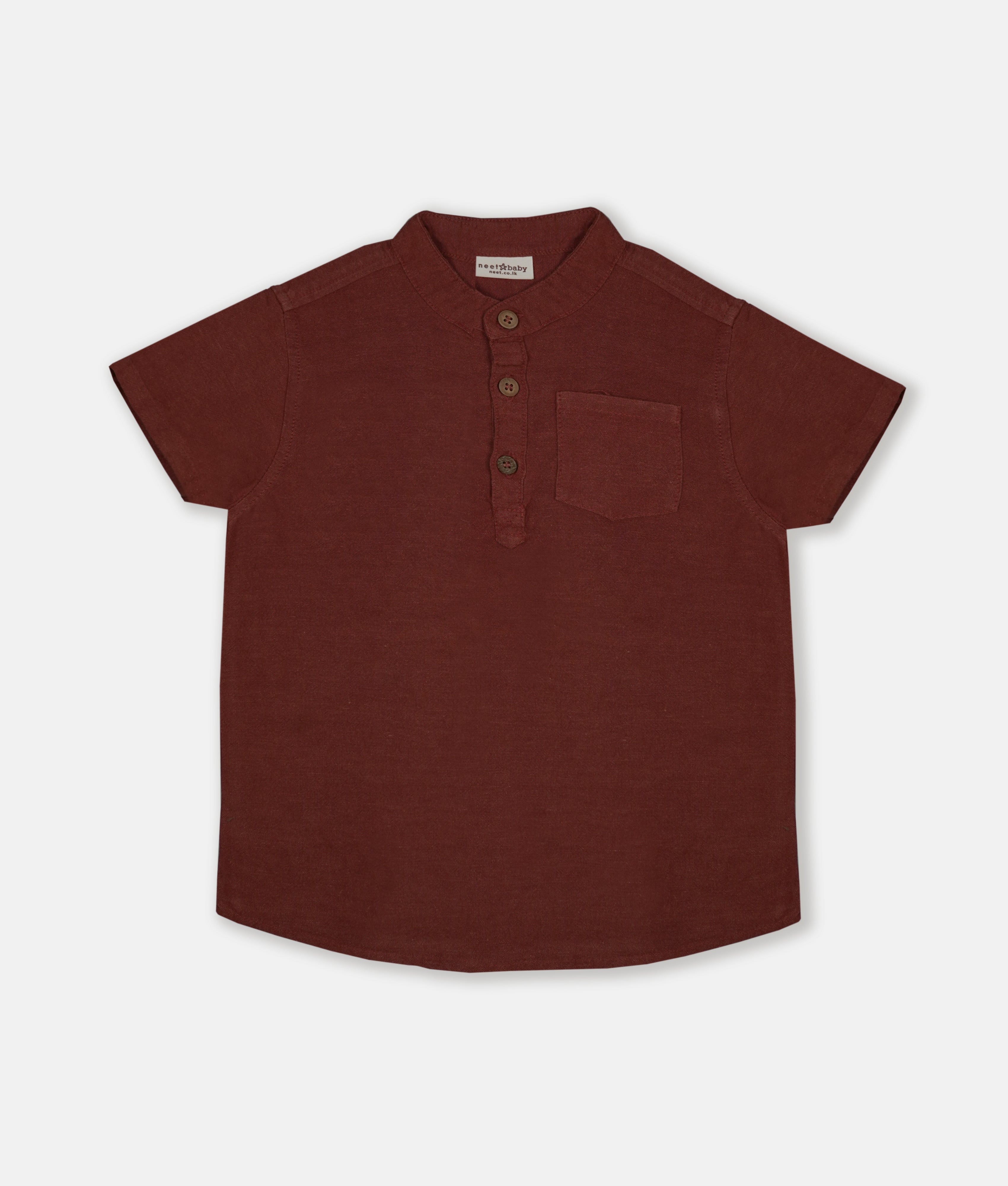 Maroon Chinese Collar Short Sleeved Boys Shirt Perfect for everyday wear and school, this classic ivory shirt features a traditional Chinese collar and short sleeves. Crafted with care in Sri Lanka, it combines comfort with timeless style for active boys.Â