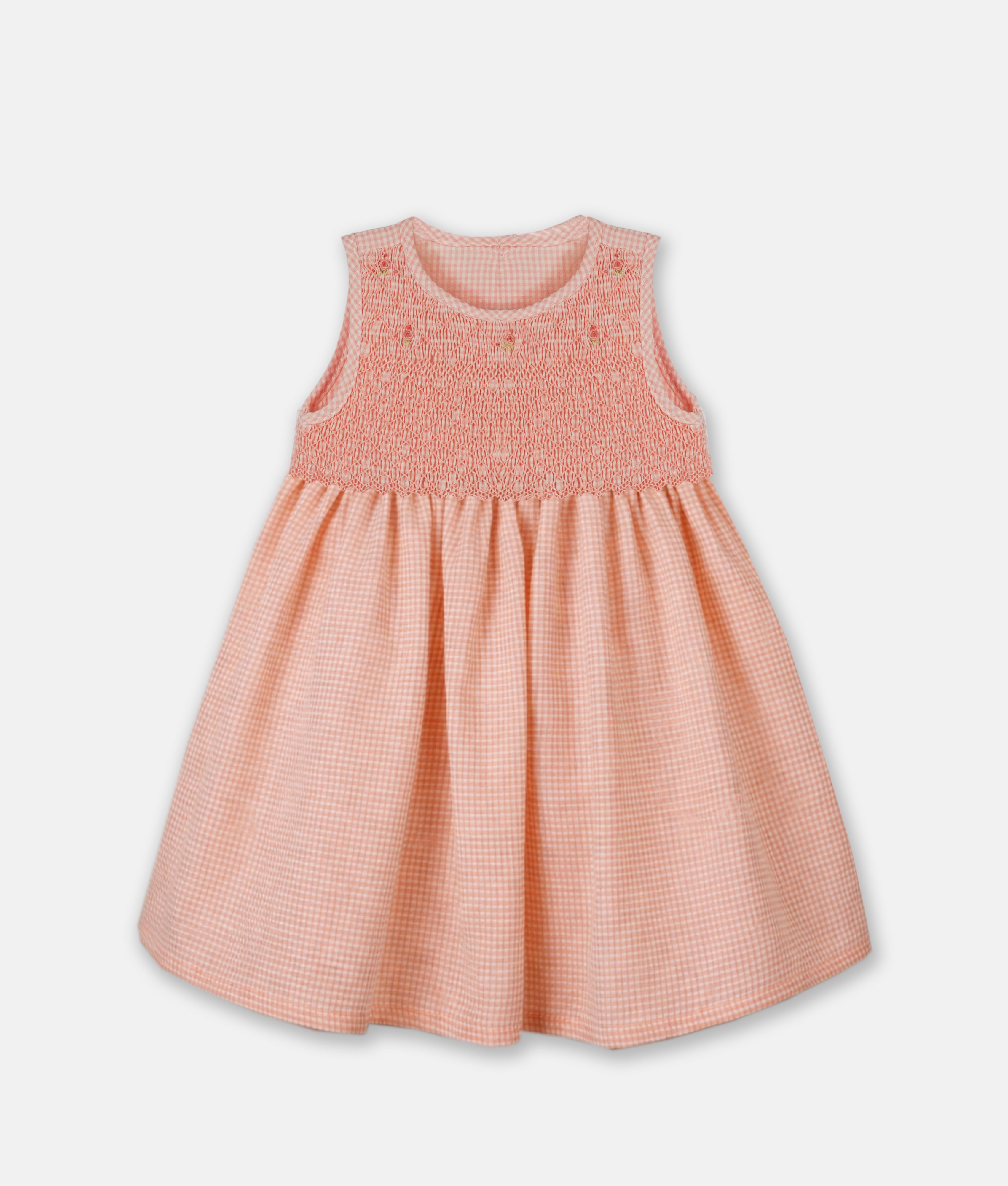 Adorable peach checked cotton dress designed for little ones who love timeless style. Featuring delicate smocking detail and a charming rose-inspired color palette, this piece combines comfort with classic elegance. The soft cotton fabric ensures all-day wearability, while the checkerboard pattern adds a playful touch perfect for everyday adventures or special occasions. A wardrobe essential that grows with your girl's personality.