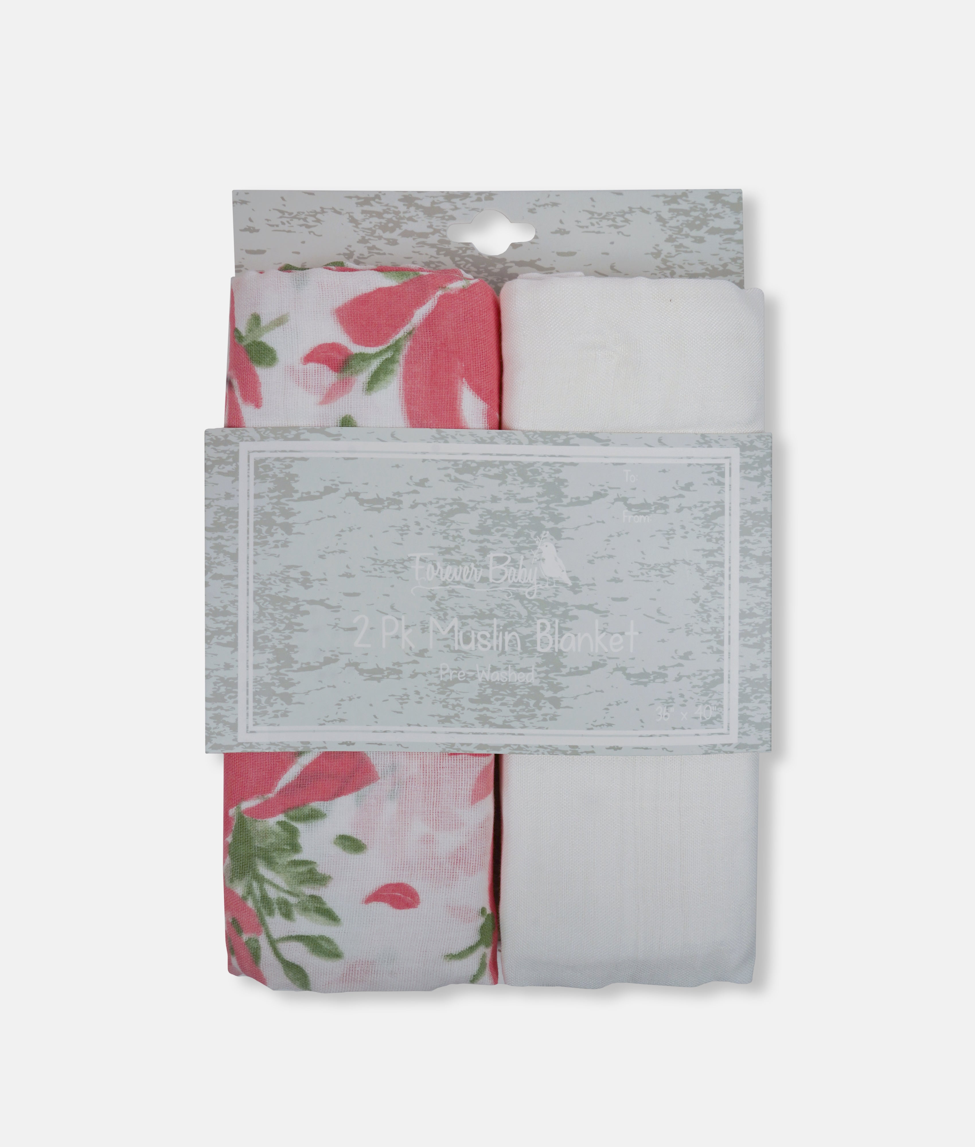 Muslin Cotton Blanket 2pc set - Plane Ivory & Rosy Floral