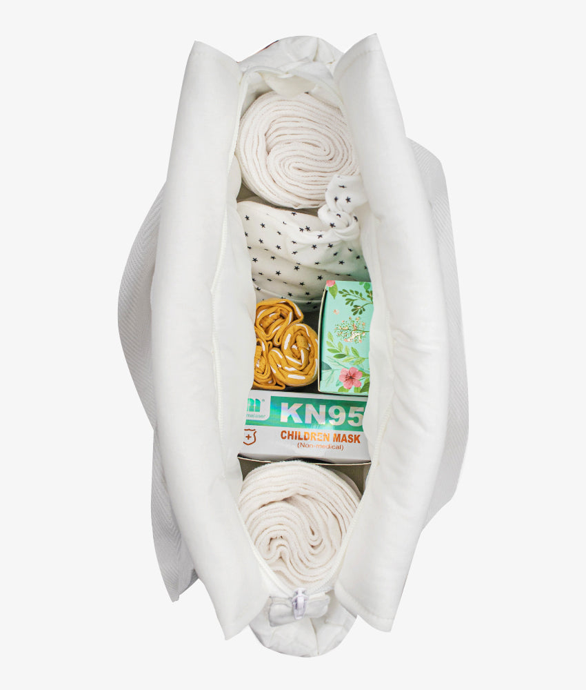 Our Baby Diaper Bag s the perfect companion for mums on the go, perfect for everyday use and light outings with your little one. This product features two side pockets and dividers inside to organize and carry those essentials you need, when you travel with your baby. Made from 100% cotton cover, and lined with easy to clean material for greater convenience. Â