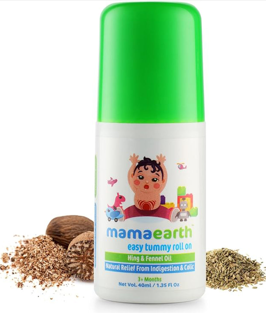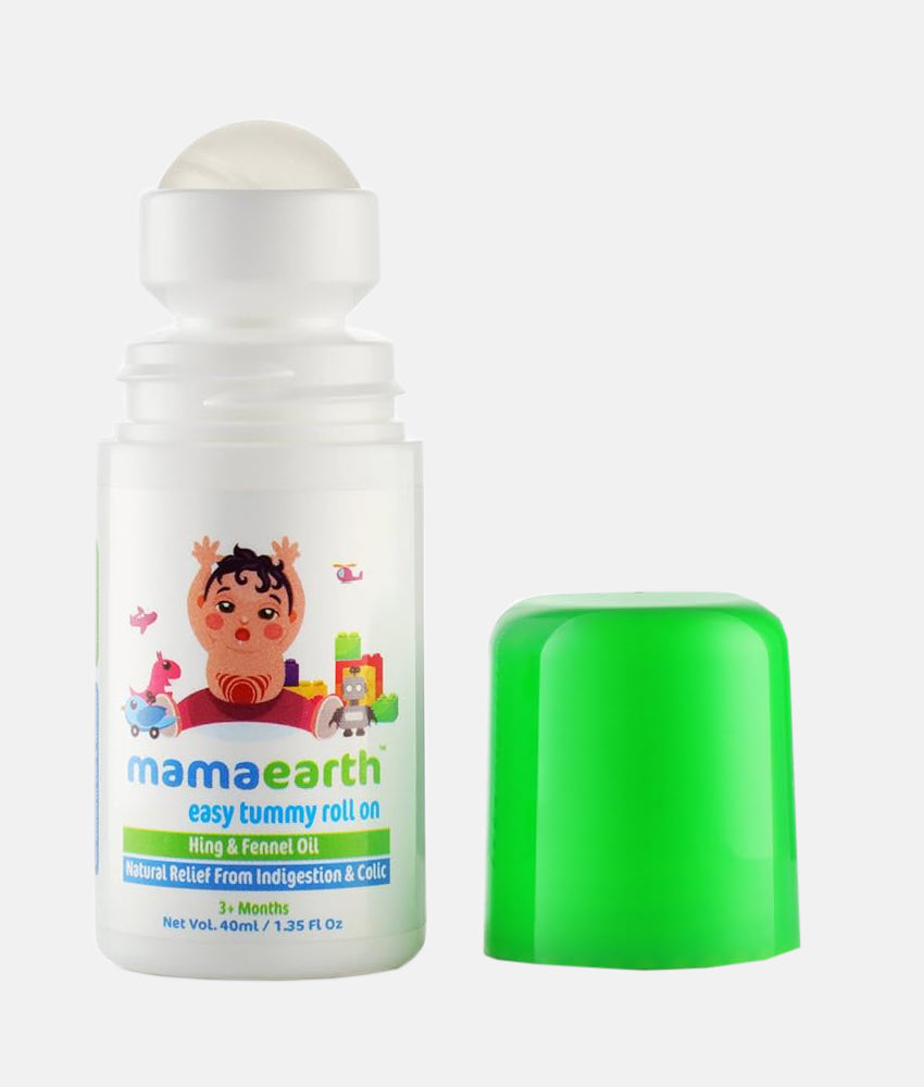 Hi! I am Mamaearth Easy Tummy Roll-On. I understand the pain babies go through because of colic and indigestion. I contain Hing Oil which is known for its ability to reduce gas & reflux issues. I am a blend of Essential Oils like Saunf Oil, Peppermint Oil, Ginger Oil & Dill Seed Oil which helps relieve stomach ache and bloating which helps the baby to sleep peacefully. I also provide a gentle effect on the baby’s skin. My Natural and Toxin-free formula with no added Preservatives, Alcohol, Petroleum, Mineral Oil, Artificial Fragrances, SLS or any other harmful chemicals is safe to be used on sensitive skin