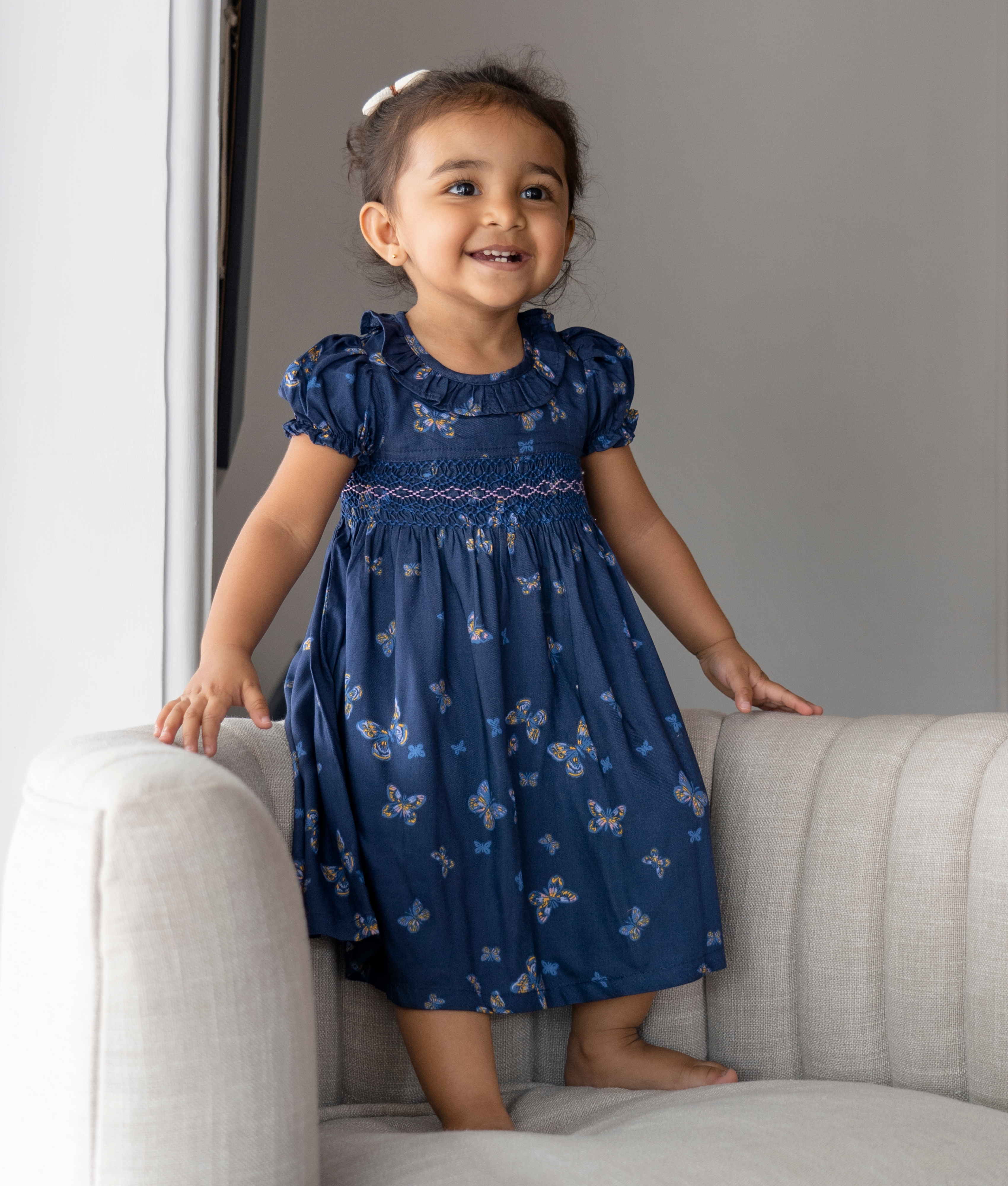 This navy blue butterfly print dress is perfect for both casual and school wear. The smocked design adds a touch of elegance while the print adds a playful touch. Made with high-quality fabric, this dress is comfortable and durable for all-day wear. Elevate your little one's wardrobe with this charming dress.